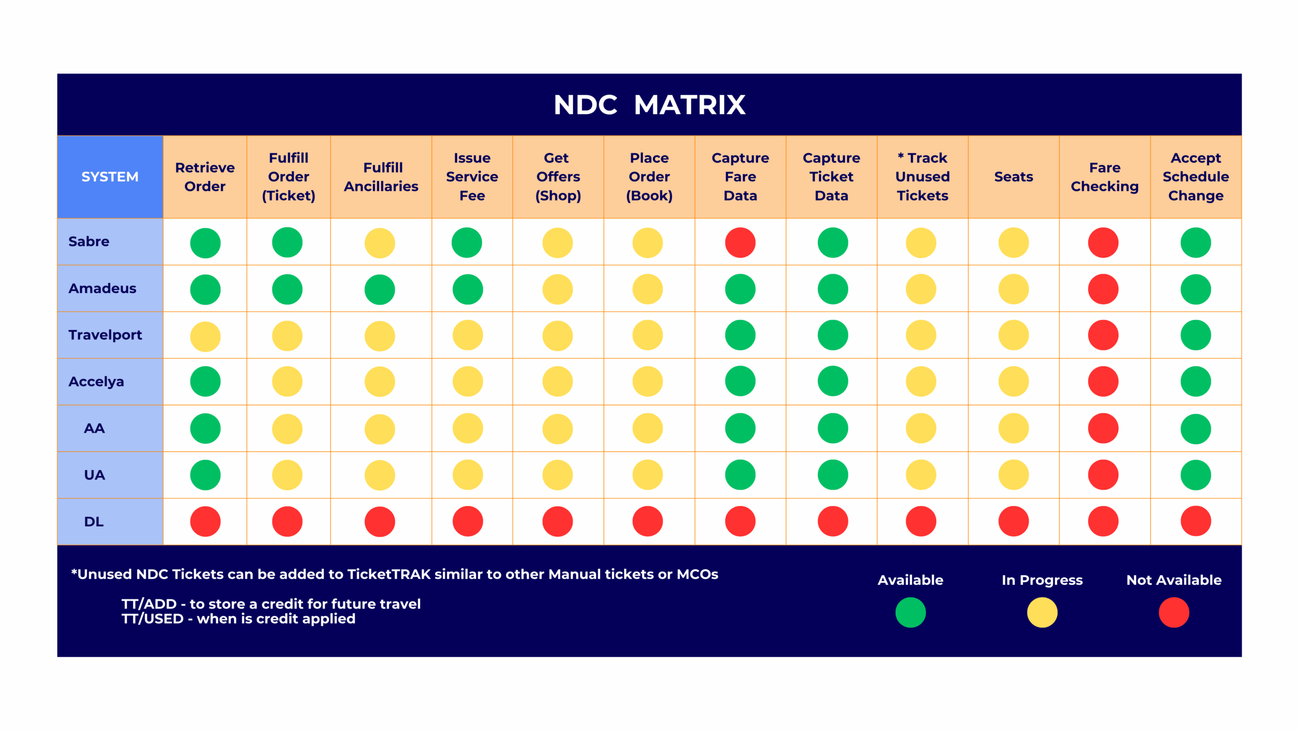 The NDC Matrix offers a visual snapshot of current functionality across key systems and carriers supported by Cornerstone.